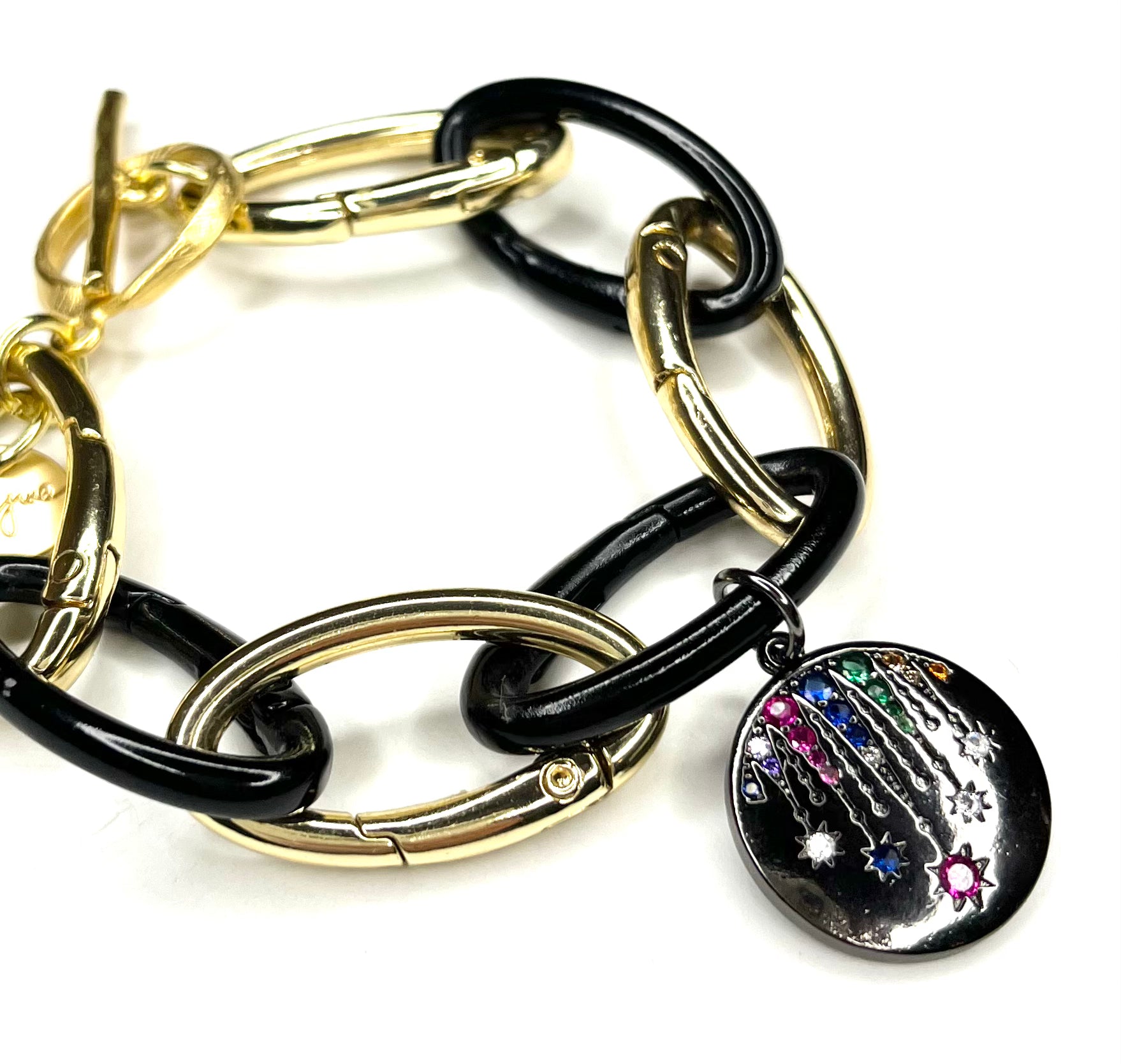 - A great example of the mixed media jewelry trend- this gold and black combo adapts well to any curated bracelet collection