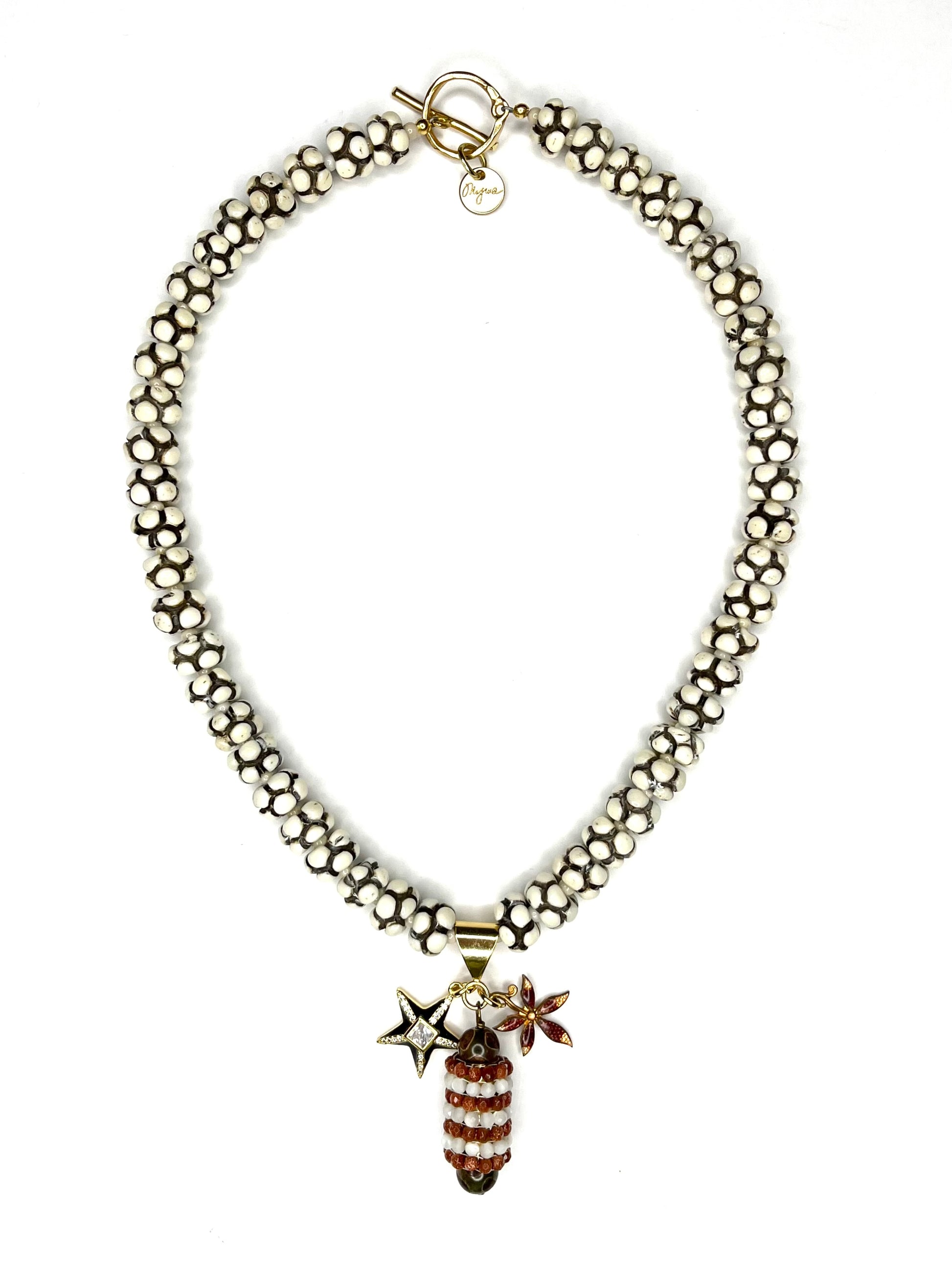 - Gemstone Handmade Jewelry- unique handwoven beaded pendant and charms hang from carved horn beaded necklace adding that flavor of laid back luxe