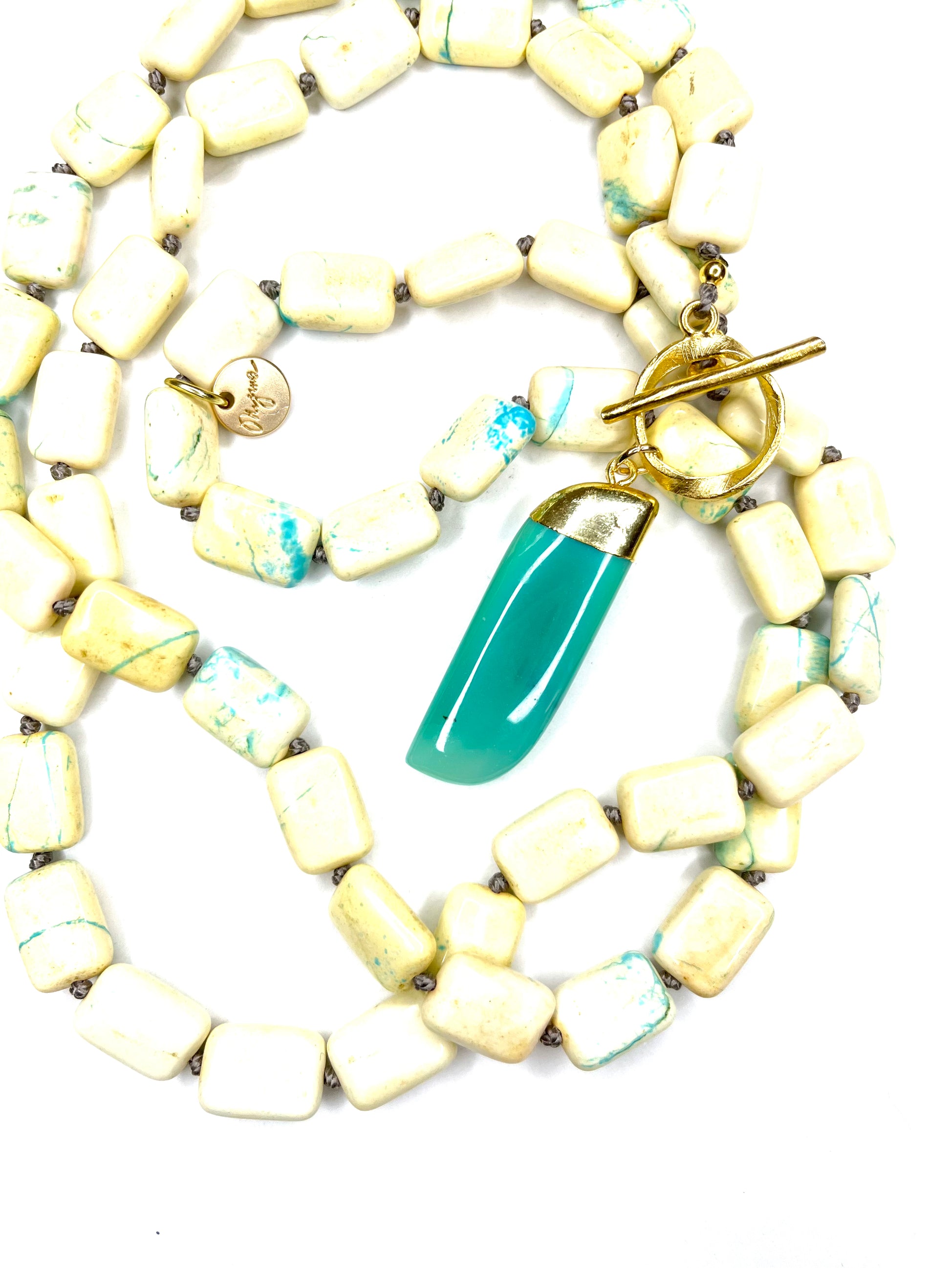 Magnesite Hand Knotted Long Necklace with Green Chalcedony Pendant