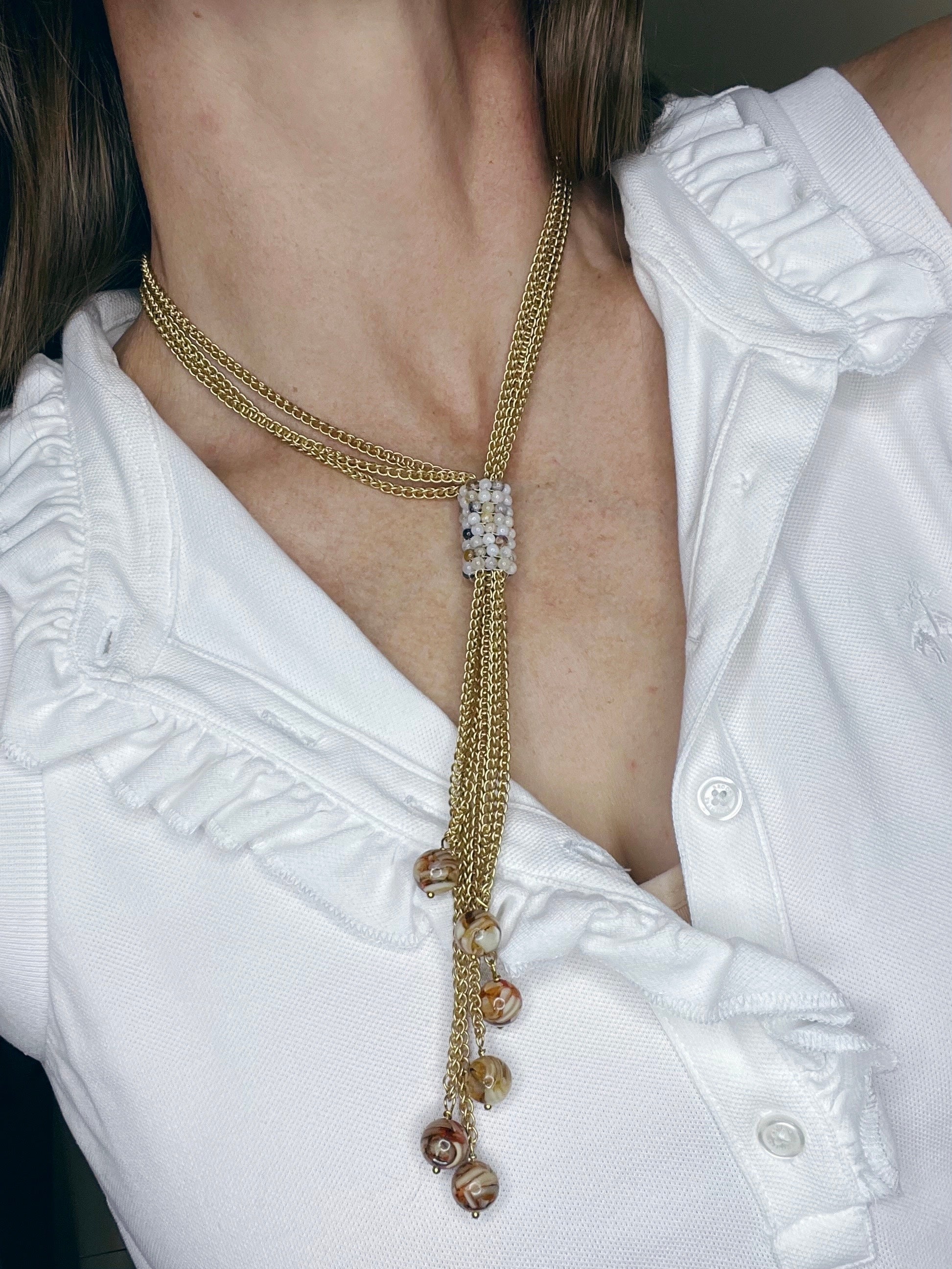 - Beautiful Gold Necklace- a lariat style necklace that features rich hued marble beads at the end of the chains to evoke classic elegance