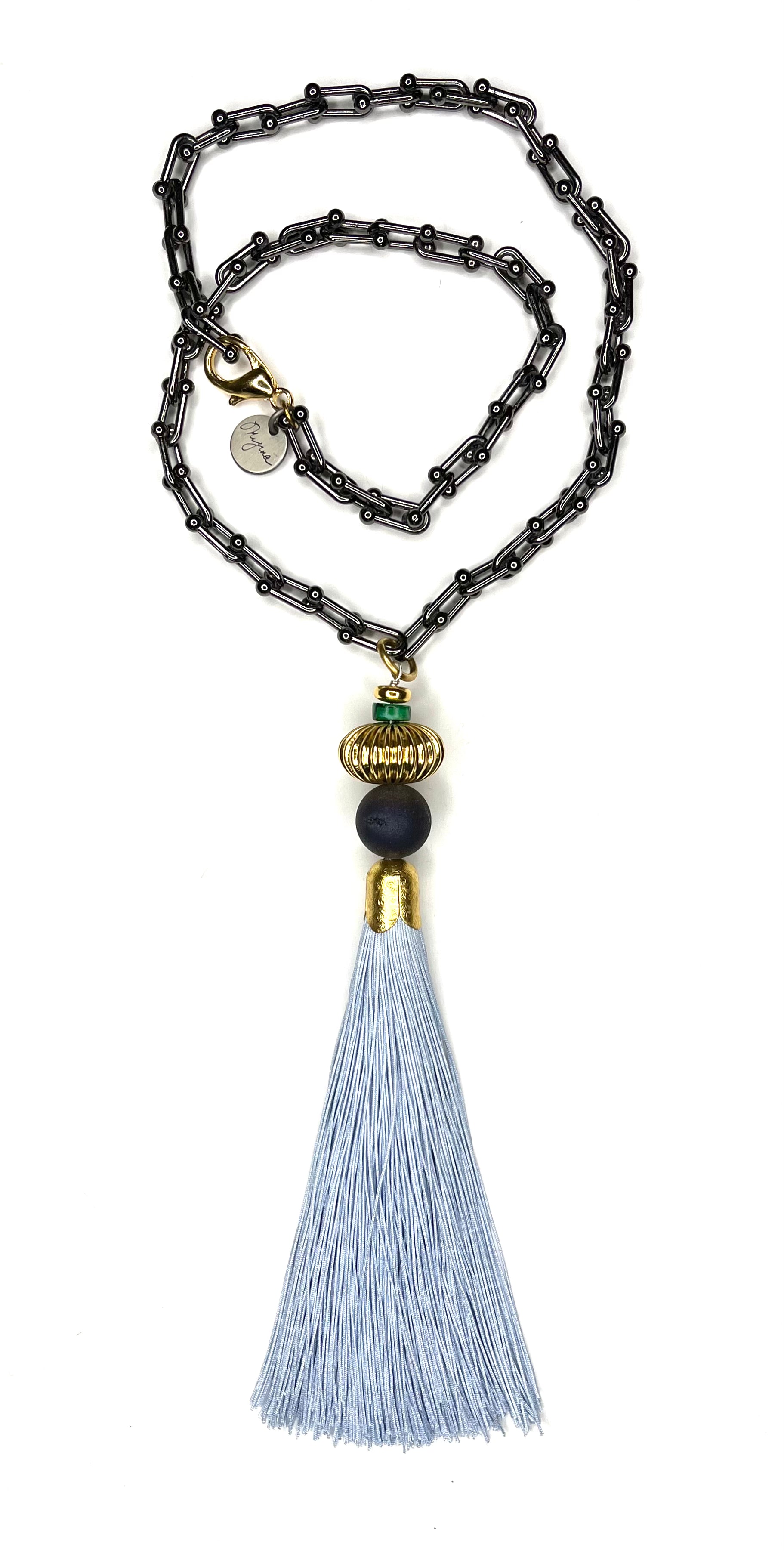 This silk tassel statement necklace features an edgy gunmetal chain paired with a bold vintage gold accent bead. Designed for modern, confident styling, it delivers contrast, movement, and a strong visual presence.