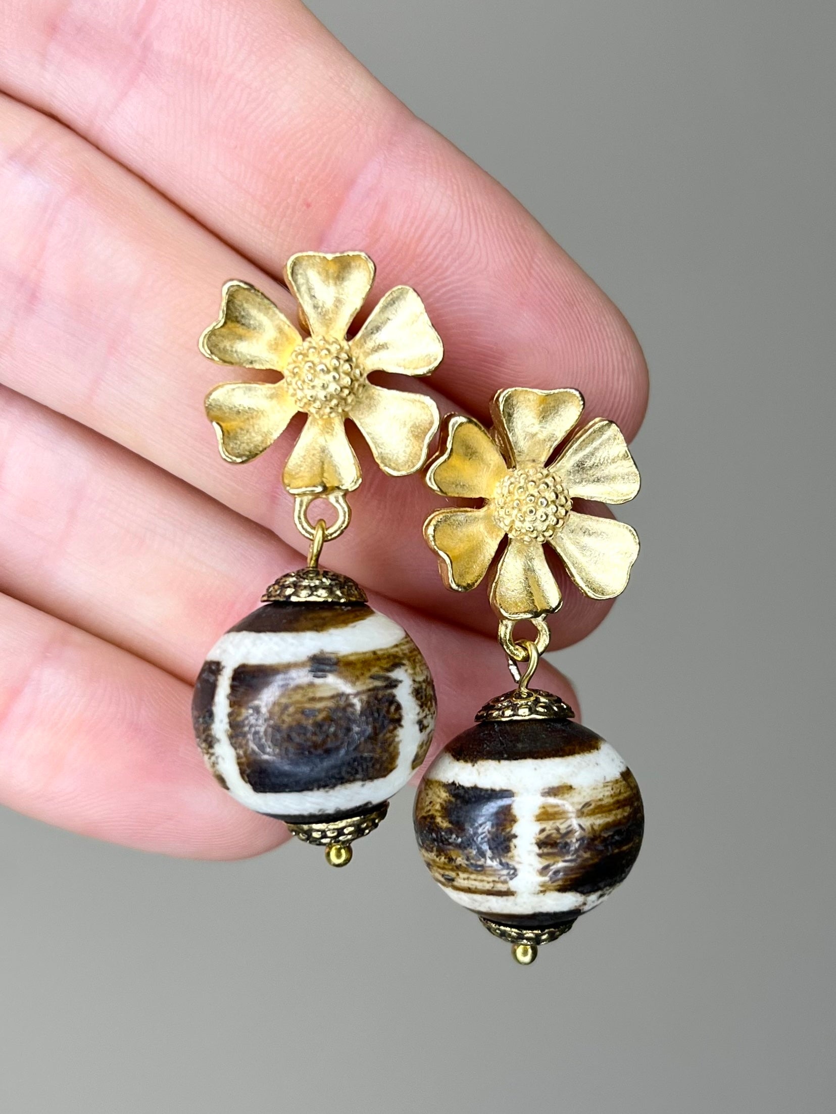 - Flower Post Earrings- Stunning chocolate brown and white bead adds vintage charm to this beautiful flower post earring